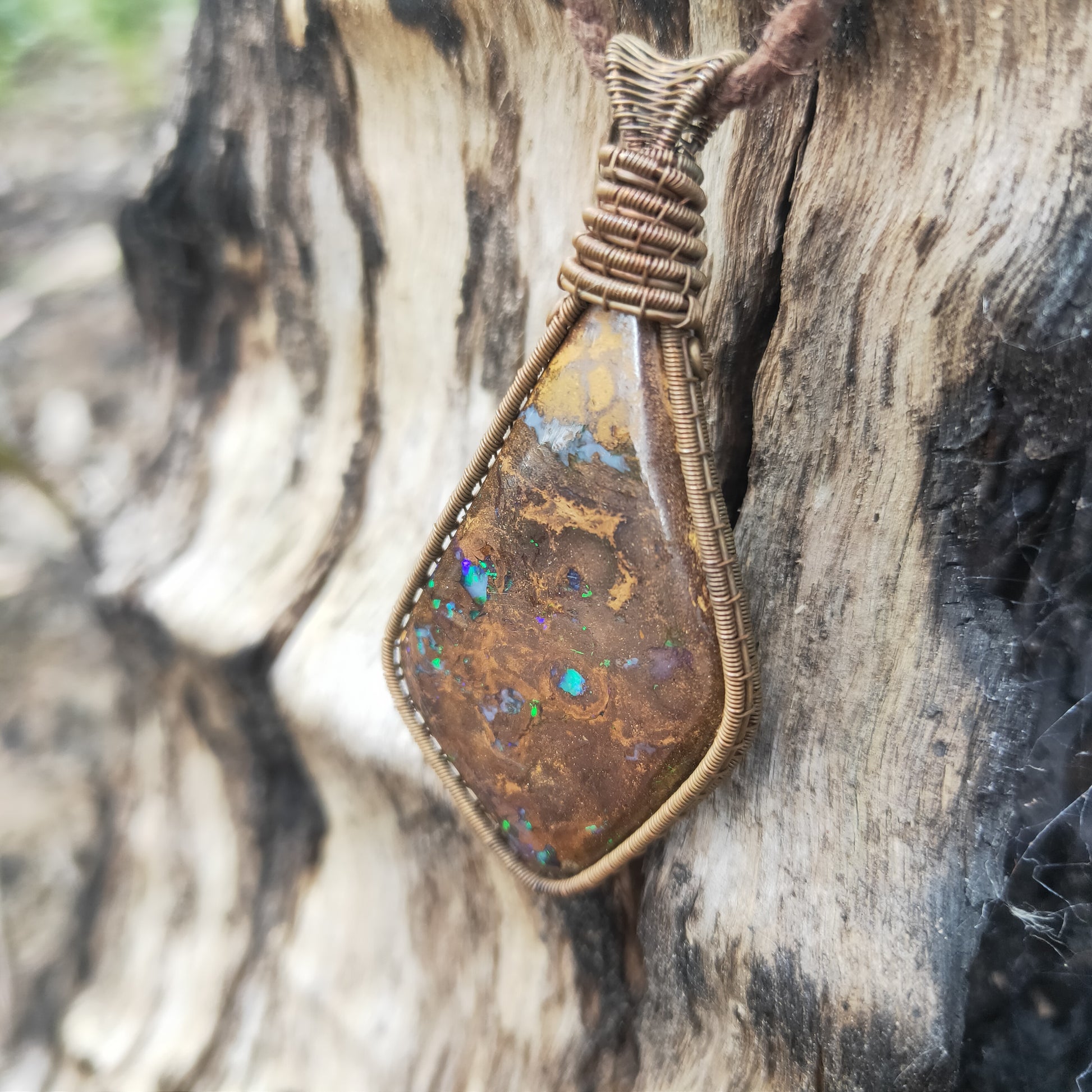 Ethically fossicked in Winton, Queensland, our boulder opal is hand cut and polished by us, in the bus. Authentic Adorning expertly wraps our pieces in copper wire, enhancing the opal's natural beauty with a touch of rustic charm. Deliberate oxidation of the copper brings forth a rich patina, infusing the piece with depth, character, and a timeless elegance.