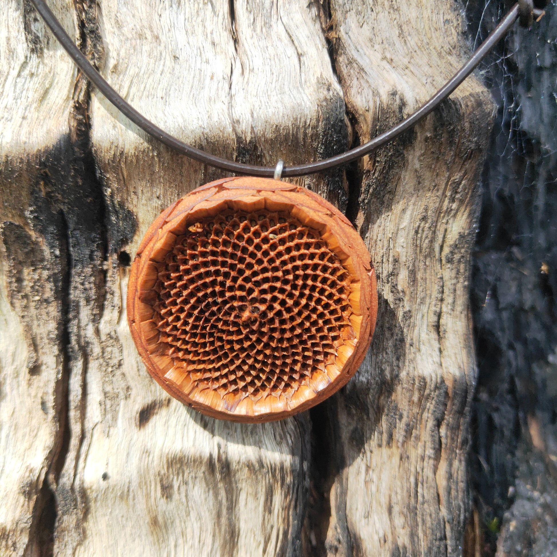 This Protea Pendant was made by us, in our bus.  We turn natural Protea Hearts into wearable, earthy pieces, showcasing the natural beauty of their patterns.