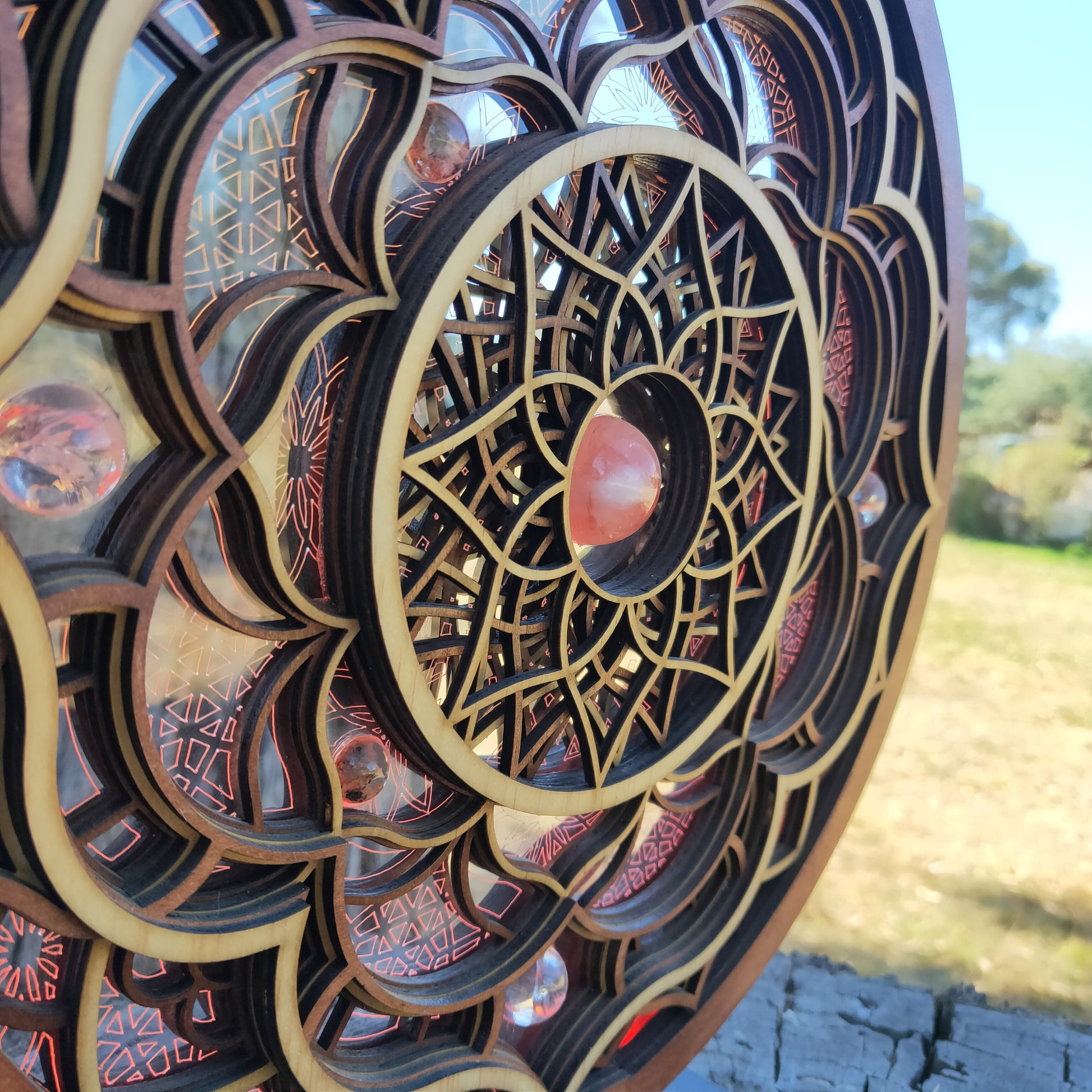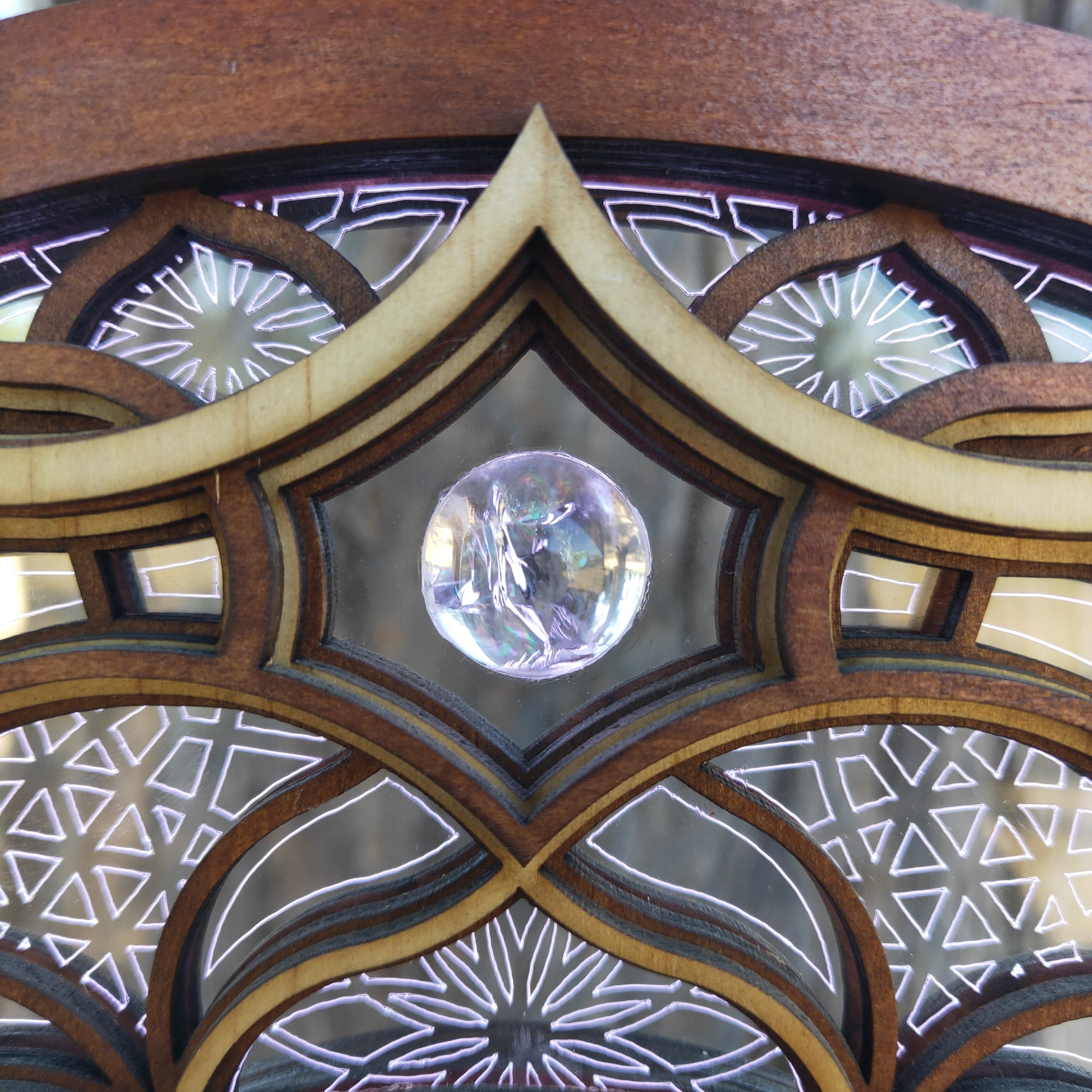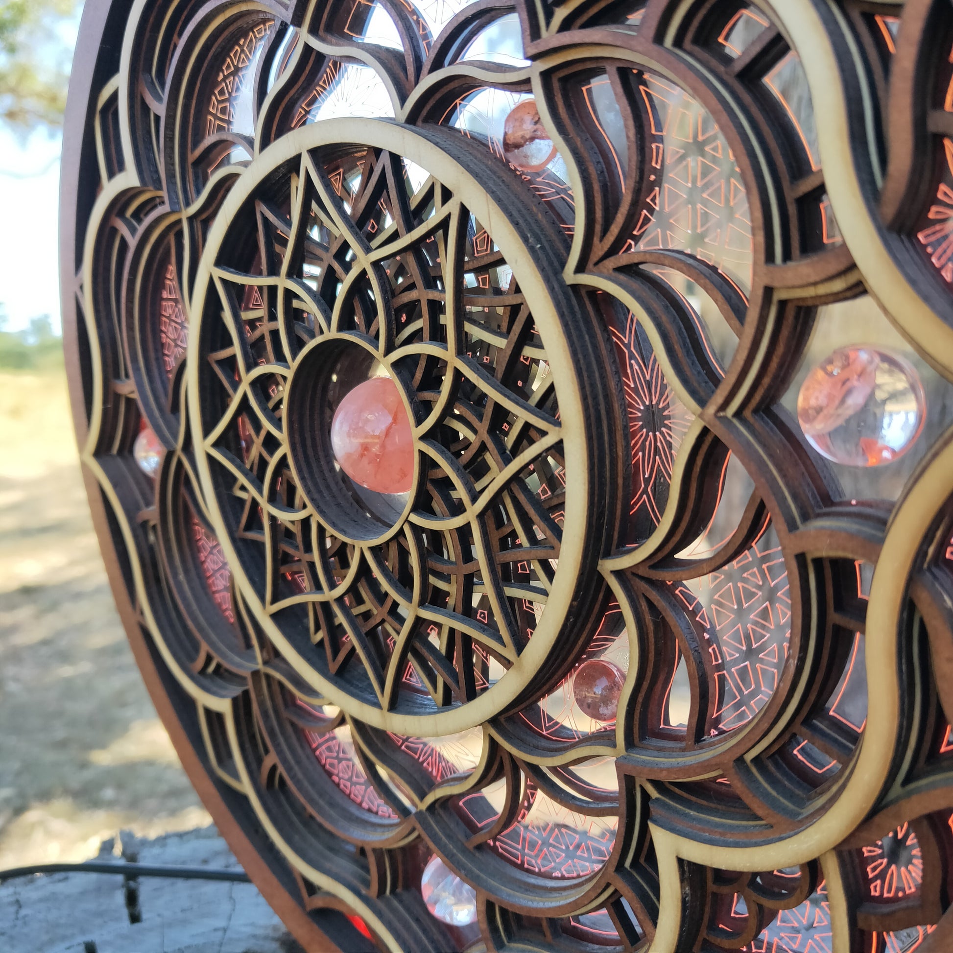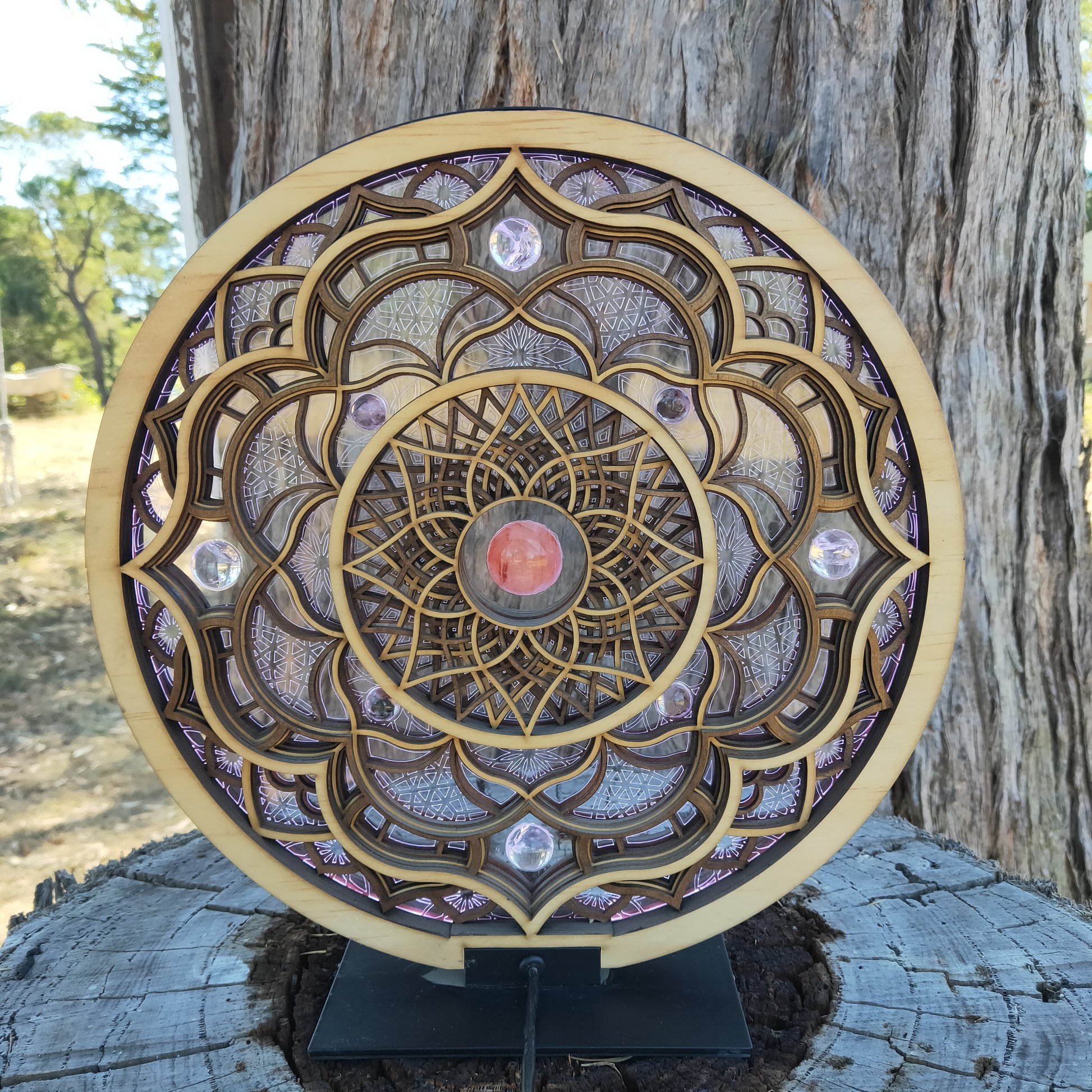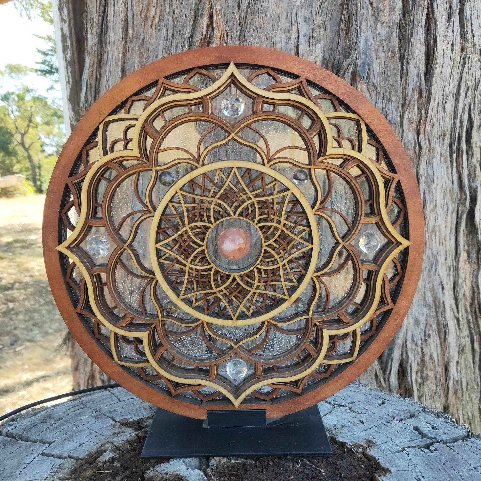 Solaris is an ode to the symbiotic harmony between the ever emerging silicone based lifeforms and sacred geometry. This LED light is comprised of 8 wooden layers and an acrylic core. It features a Fire Quartz centre and is surrounded by Clear Quartz and Garden Quartz spheres. Programable through the GRID Connect phone App, this light has extensive settings, including sound syncing and modern smart features. Solaris can be reversed to reveal lighter wooden tones.